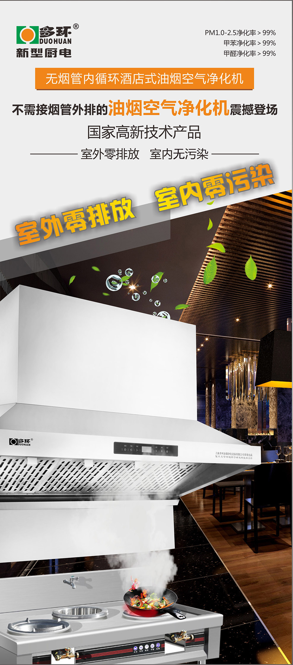 多環(huán)凈化設備公司研發(fā)生產的無管式內循環(huán)油煙凈化機是不用煙管對外排放的油煙凈化設備,采用吸排凈化一體機的形式將烹飪產生的油脂、煙顆粒物及有害氣體(醛、苯、VOCs等)、異味(辣、臭、酸味等)和有害細菌在室內進行凈化處理的廚電產品。(*數(shù)據(jù)來源于上海市環(huán)境保護產品質量監(jiān)督檢驗總站出具的《檢測報告》報告編號:2016|20-35-885523/2016|20-35-885524)