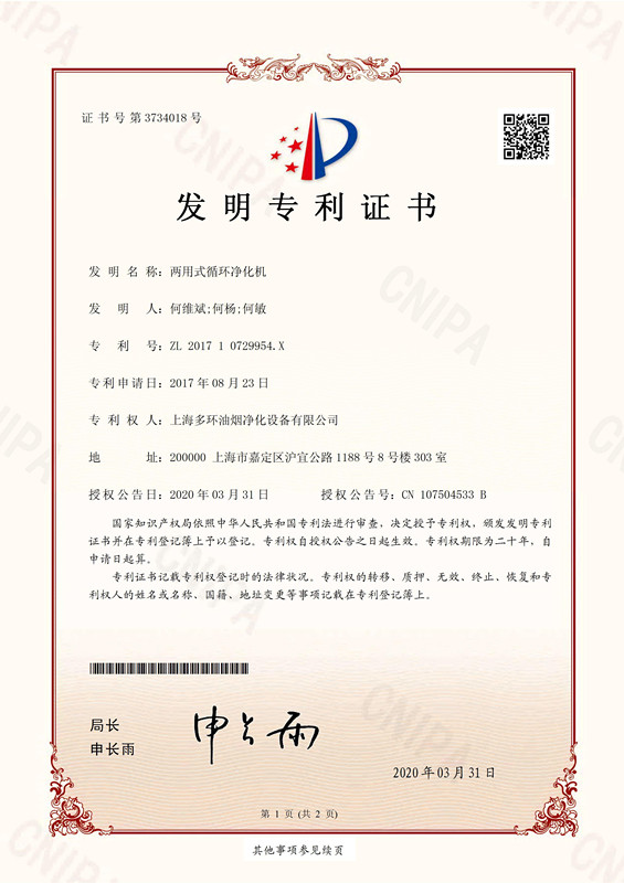 喜報(bào)!喜報(bào)!熱烈祝賀無煙管內(nèi)循環(huán)油煙凈化機(jī)行業(yè)開創(chuàng)企業(yè)上海多環(huán)油煙凈化設(shè)備有限公司再次獲得國家發(fā)明專利授權(quán)。